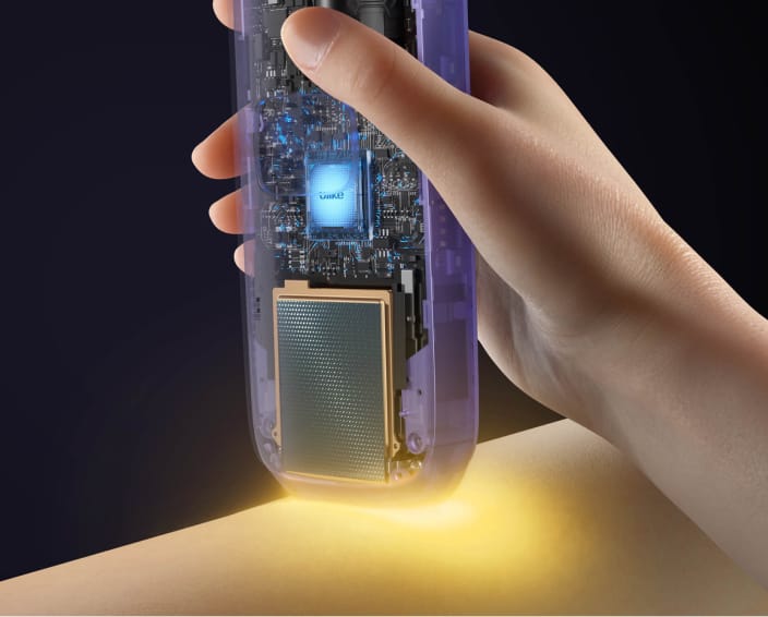 Notre épilateur à lumière pulsée, l'Air 3, maintient une température de contact fraîche, ce qui garantit une épilation presque indolore même sur les zones les plus sensibles, tout en réduisant le risque de brûlures et d'irritations.